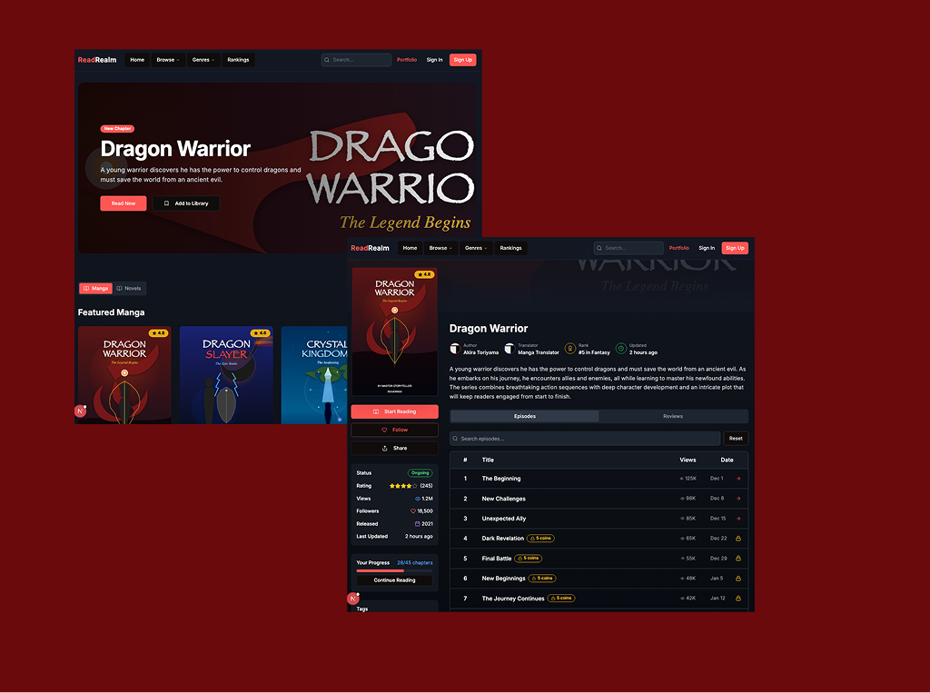 A manga and book reading platform with CMS, payment integration, VIP membership, and advertising modules. Backend powered by Golang and MongoDB.